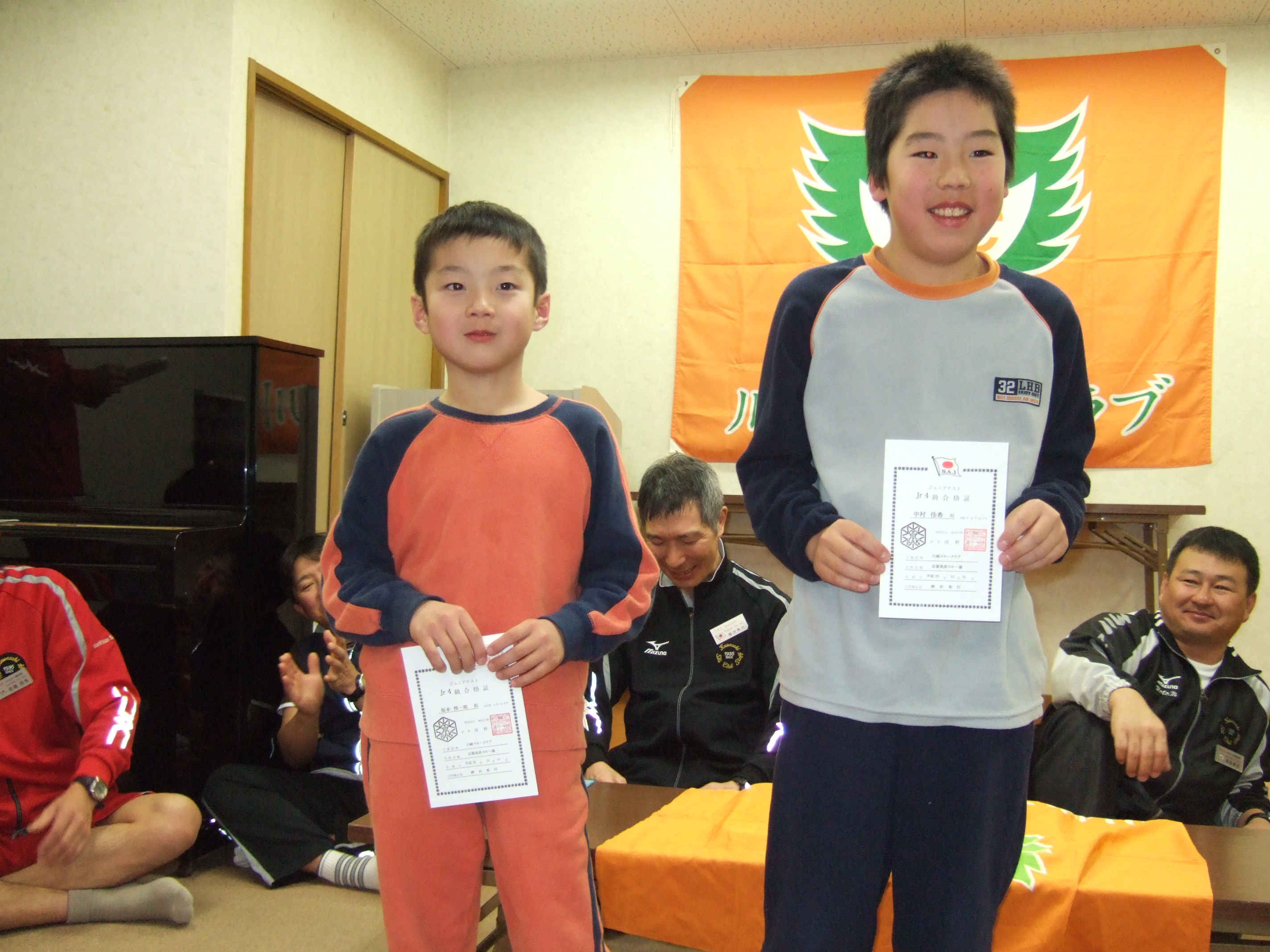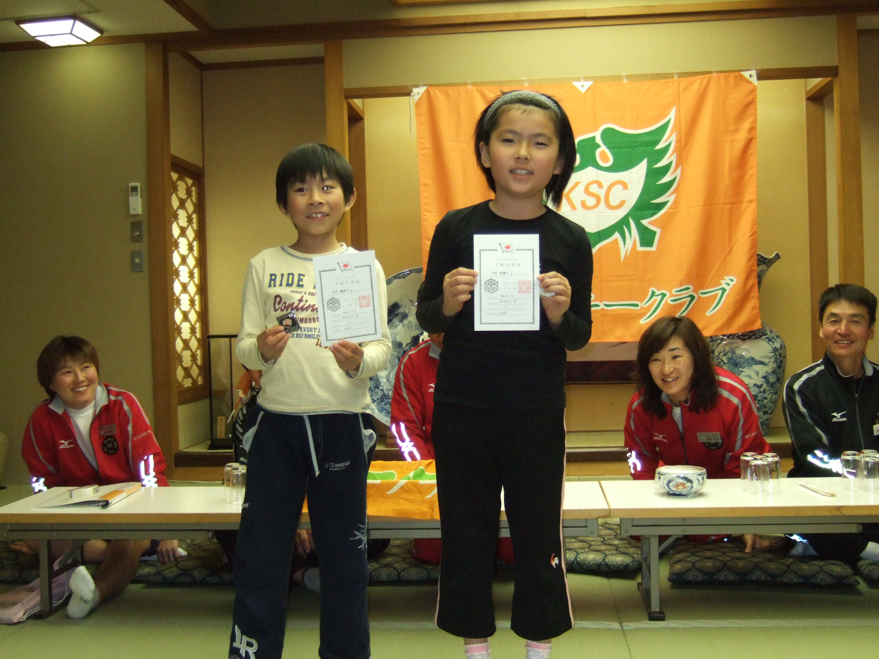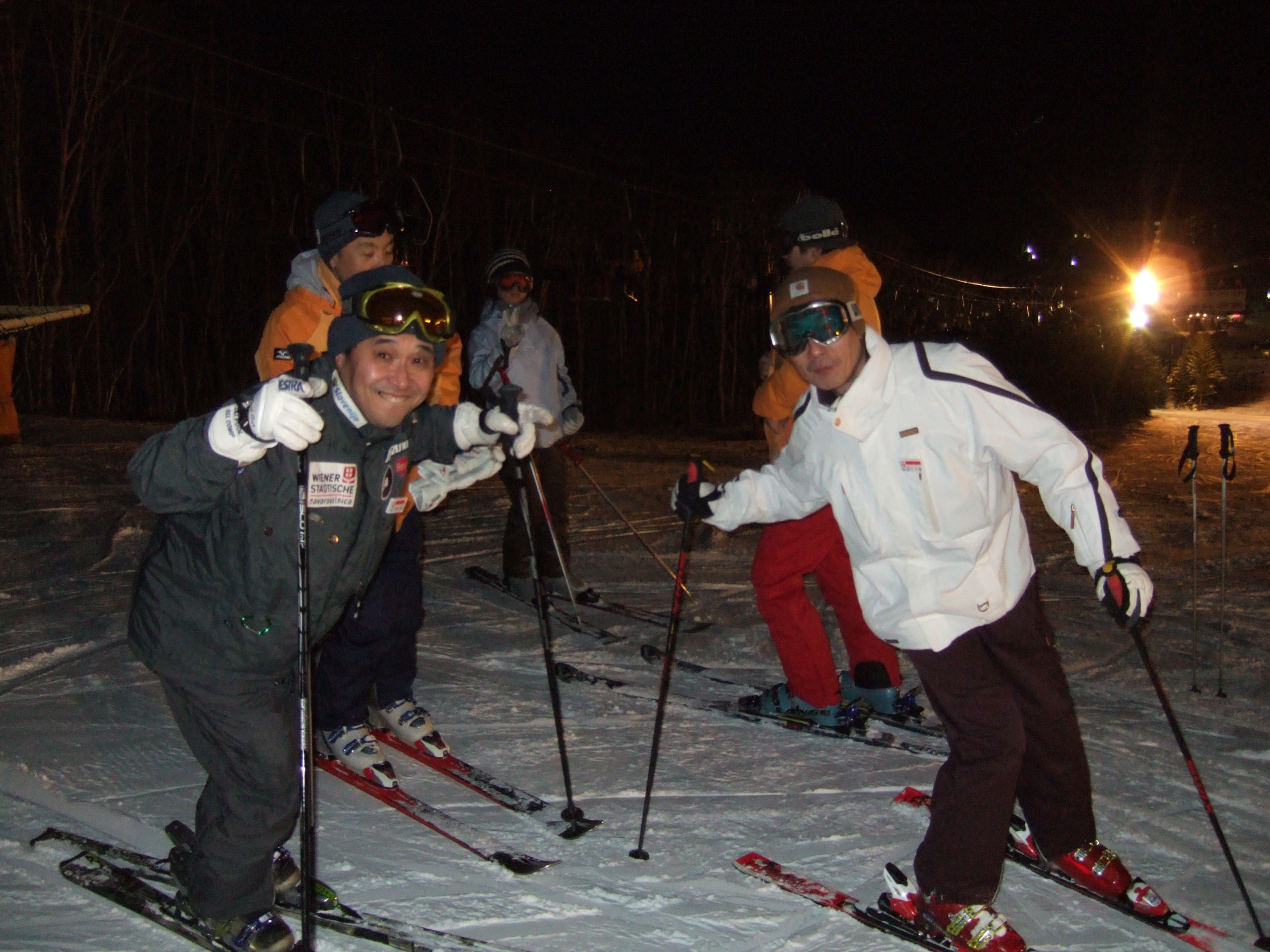 2008年12月31日(月)雪 朝から強風が吹き荒れ、リフト開始時間が遅れましたが、午前のスクールは無事行われました。 この日の午後、スキー検定が行われるため、受験者は午前中のレッスンで検定種目の特訓をしました。ジュニア班は、朝、検定バーンの設置中に本番さながら の練習をしました。みんな気合が入っていました。 いよいよ検定本番。検定バーンは、ダイヤモンドゲレンデ。天気も良くなってきて視界は良好、滑走面も良好という最高の状態で望むことが出来たのではないかと 思います。1級と2級には、それぞれ前走者が2名ずつ滑ります。僕も何回か経験がありますが、自分の検定以上に緊張するものです。今回は、昨シーズン 見事1級に合格したKさんに協力していただきました。 夕食後は、お待ち兼ねの検定合格者発表。結果は、2級3名、1級4名合格でした。みなさん、おめでとうございます。合格発表に続いて、懇親会を行いました。 懇親会は、豪華景品をかけたジャンケン大会あり、川崎区東門前にある『焼き物屋 だいき』さんの差し入れの『肉のかたまり』(僕はなんて言うかわかりません) ありで大いに盛り上がりました。 盛り上がった懇親会の後は、0時に始まる一の瀬ゲレンデで行われる花火と「たいまつスキー」を見物しに行きました。その後一の瀬神社や高天ヶ原神社で初詣をする人もいました。外は寒かったですが、神社で御神酒をいただき温まりました。