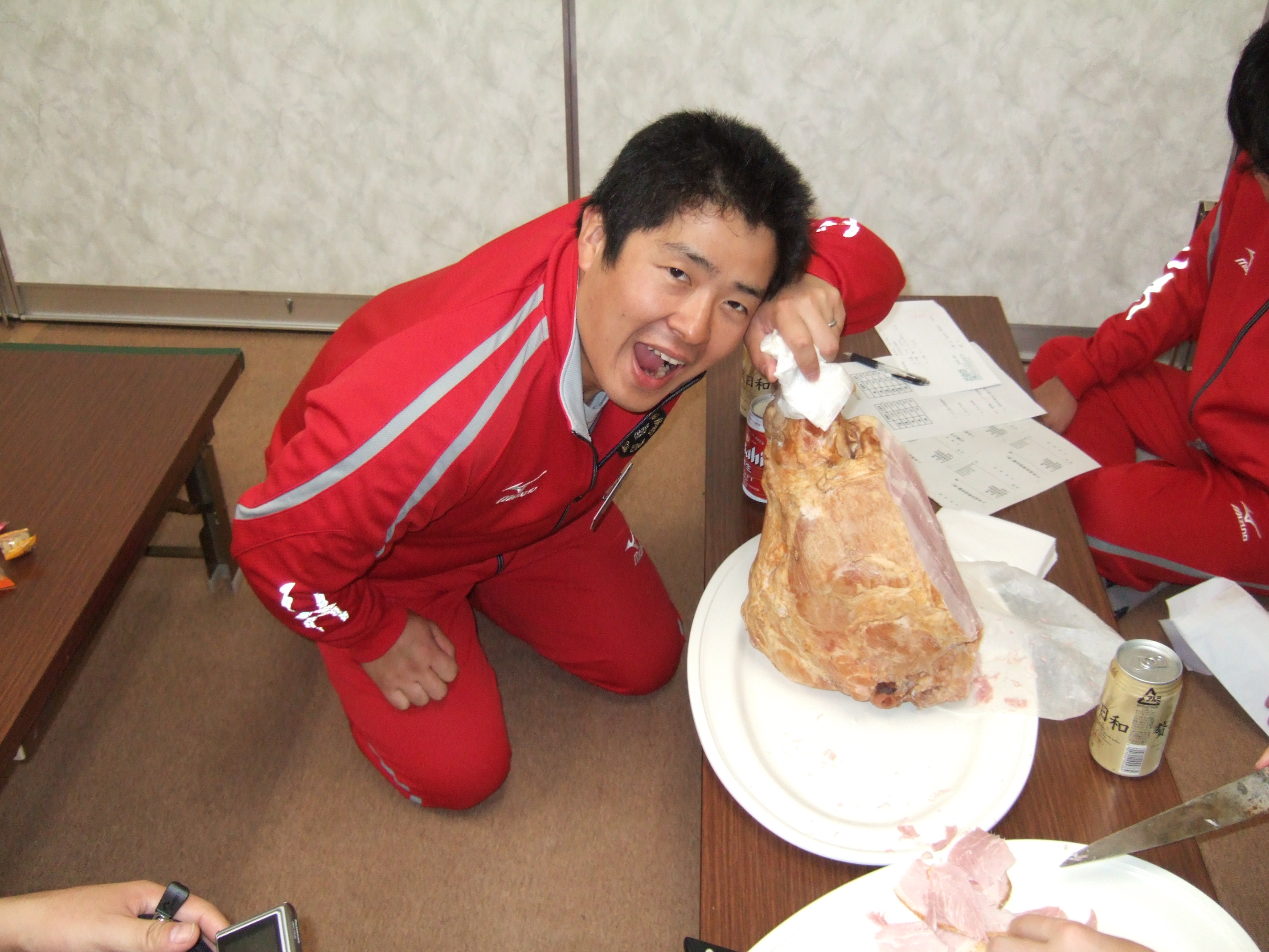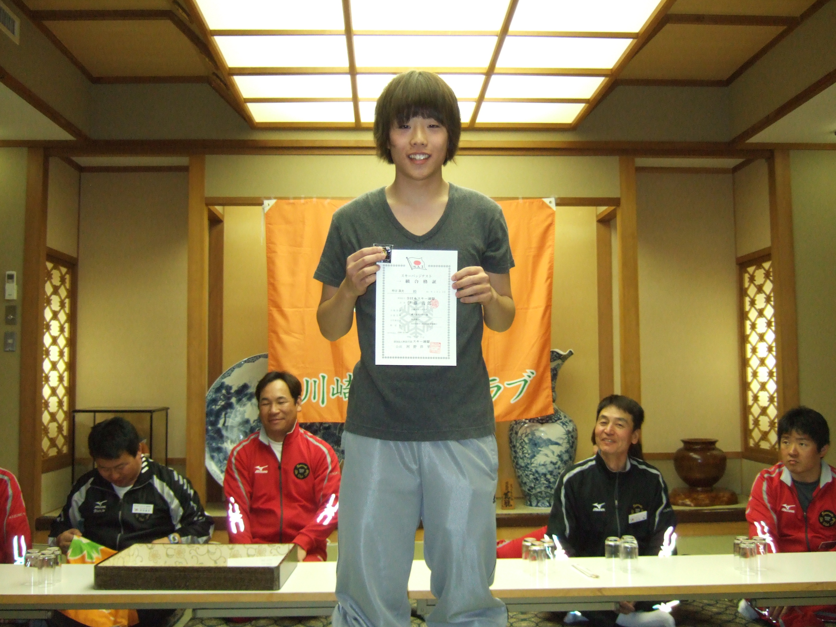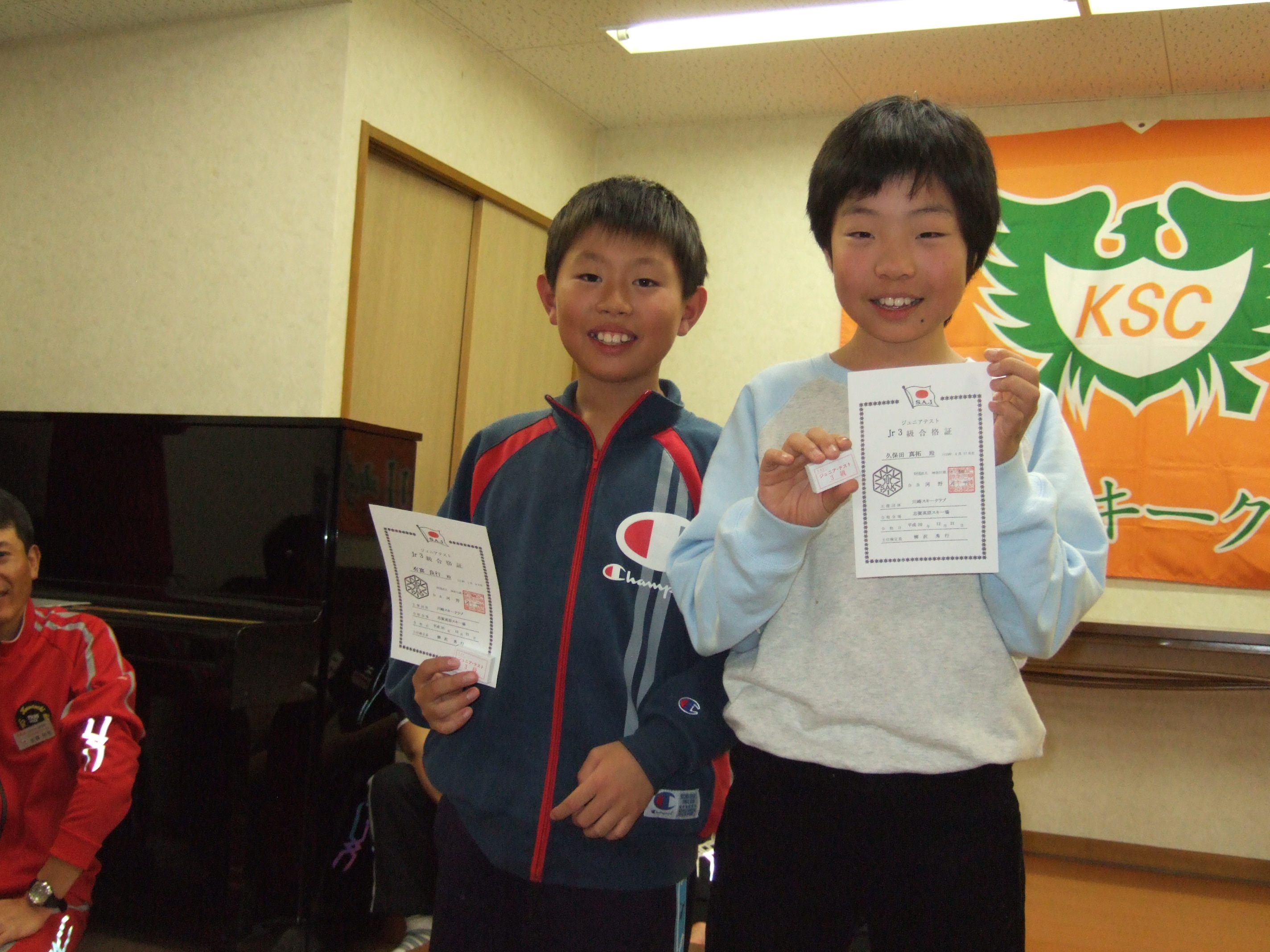 2008年12月31日(月)雪 朝から強風が吹き荒れ、リフト開始時間が遅れましたが、午前のスクールは無事行われました。 この日の午後、スキー検定が行われるため、受験者は午前中のレッスンで検定種目の特訓をしました。ジュニア班は、朝、検定バーンの設置中に本番さながら の練習をしました。みんな気合が入っていました。 いよいよ検定本番。検定バーンは、ダイヤモンドゲレンデ。天気も良くなってきて視界は良好、滑走面も良好という最高の状態で望むことが出来たのではないかと 思います。1級と2級には、それぞれ前走者が2名ずつ滑ります。僕も何回か経験がありますが、自分の検定以上に緊張するものです。今回は、昨シーズン 見事1級に合格したKさんに協力していただきました。 夕食後は、お待ち兼ねの検定合格者発表。結果は、2級3名、1級4名合格でした。みなさん、おめでとうございます。合格発表に続いて、懇親会を行いました。 懇親会は、豪華景品をかけたジャンケン大会あり、川崎区東門前にある『焼き物屋 だいき』さんの差し入れの『肉のかたまり』(僕はなんて言うかわかりません) ありで大いに盛り上がりました。 盛り上がった懇親会の後は、0時に始まる一の瀬ゲレンデで行われる花火と「たいまつスキー」を見物しに行きました。その後一の瀬神社や高天ヶ原神社で初詣をする人もいました。外は寒かったですが、神社で御神酒をいただき温まりました。