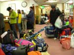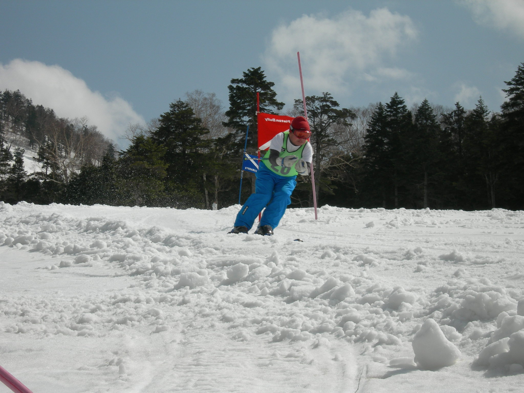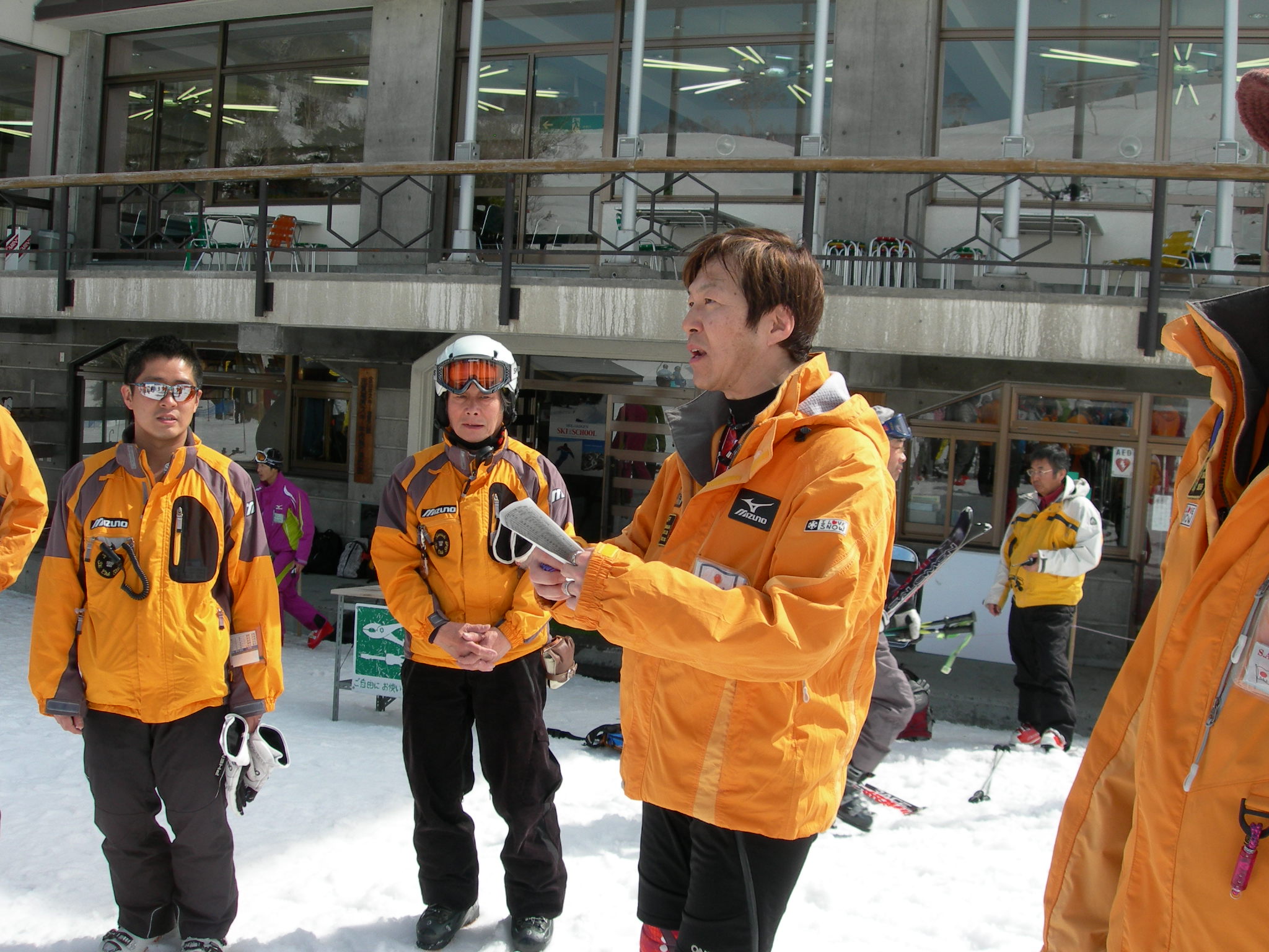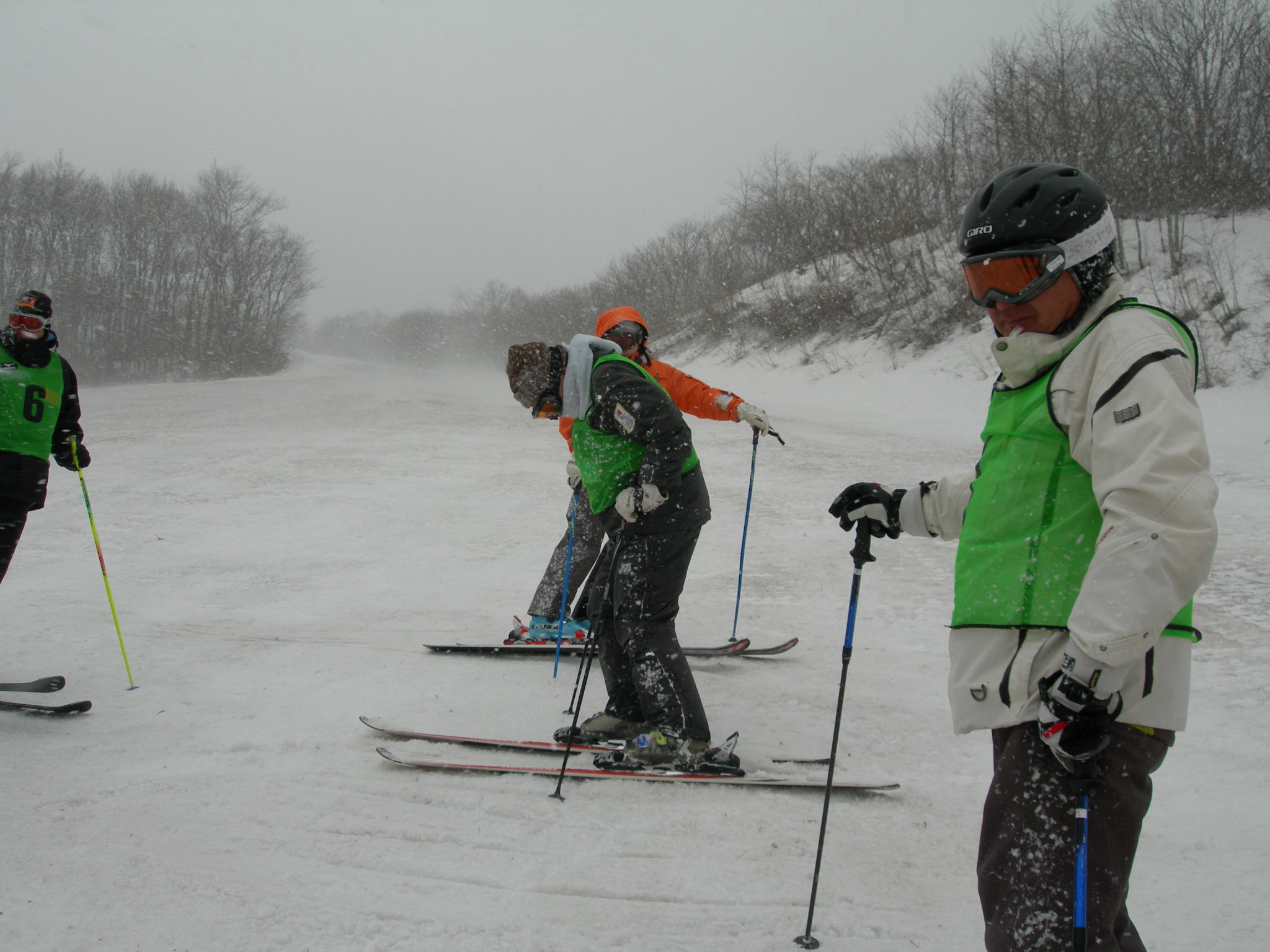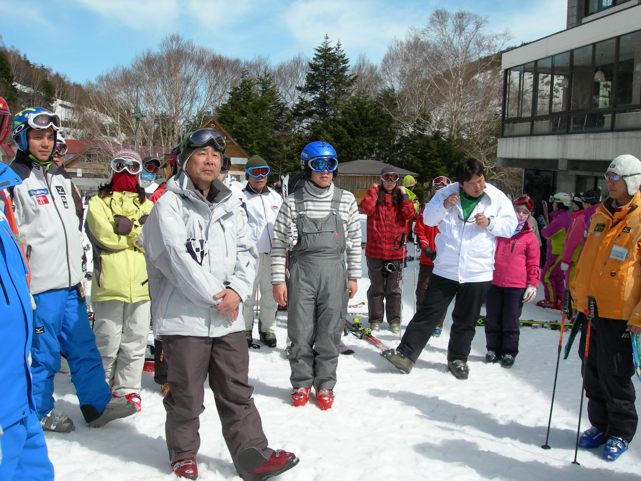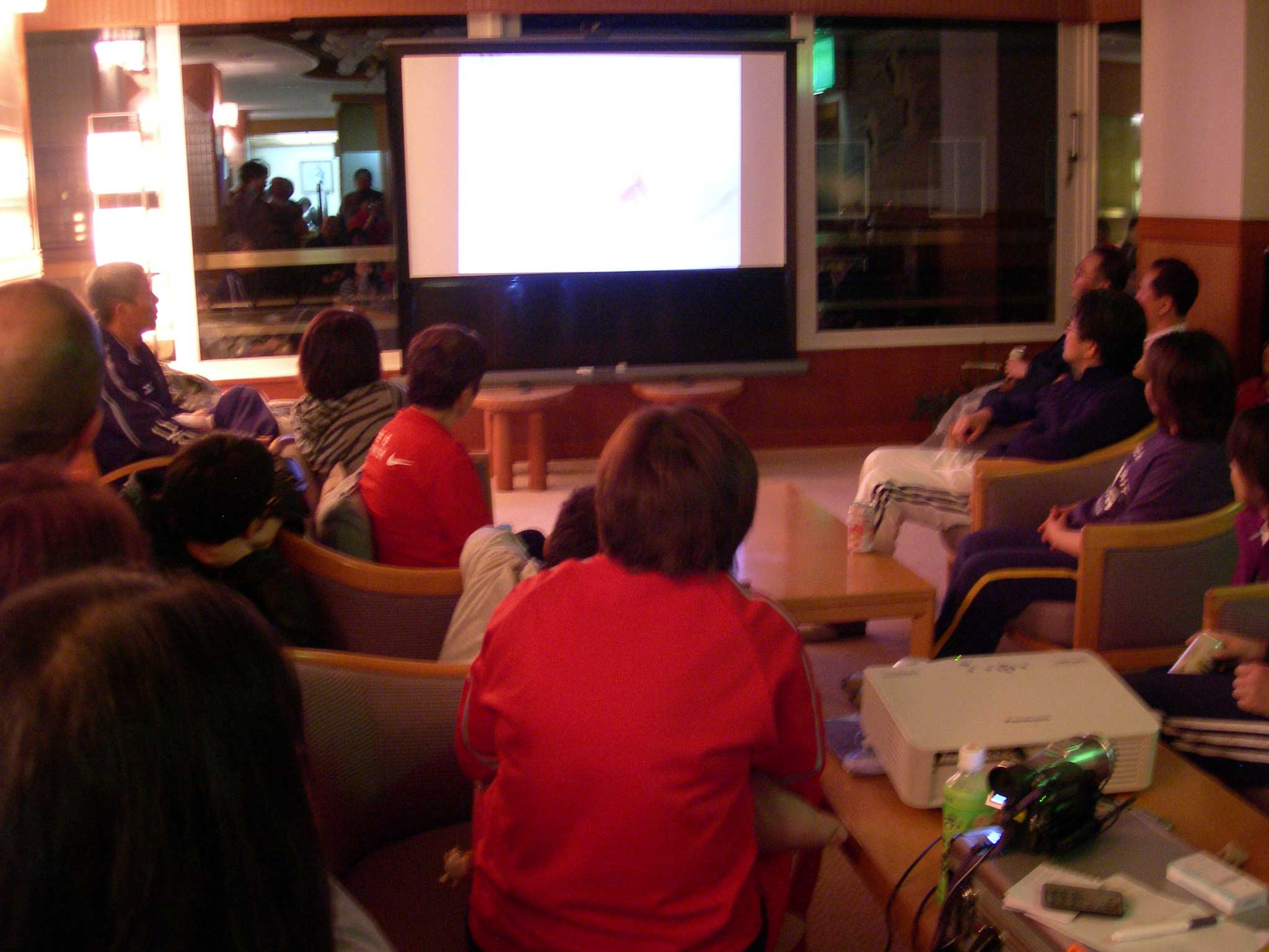 3月20日(土) 明け方、Bコースの方々が到着し、本日から合流です。 天気の方は… 薄曇り? 前日の良いお天気で、雪化粧は全て崩落。 でも、日曜日は大荒れという予報だったので、今日はガンガン滑るしかありません。 検定は翌日ですから、練習できるのは、実質今日だけです。 Bコースで来た班も、今日のうちに地蔵詣でです。 下のほうは暖かく、雪がかなり緩んでましたので、午後、昨日なかなか良かった、中央ゲレンデにて、ビデオ撮影を行いました。 …滑らなかったです(>_<) ビデオ撮影で、うまく滑れなかった方、ゲレンデのせいです(多分) 夜には、ビデオ上映会が行われました。 検定受検班は、少し多めに撮影した為、上映会にて、少し時間が押してしまい、お待たせしてしまった方、申し訳ありませんでした。 けして、町○先生の小回りを3回も上映したせいではないと思います(笑) …怖かったです(>_<) 次回担当するときには、もう少し綿密な上映計画をたてて、出来るだけお待たせしないようなご案内を出来たらと思っています。 上映会の横では、検定受付も行われ、ロビーは大賑わいで、暑いくらいでした。