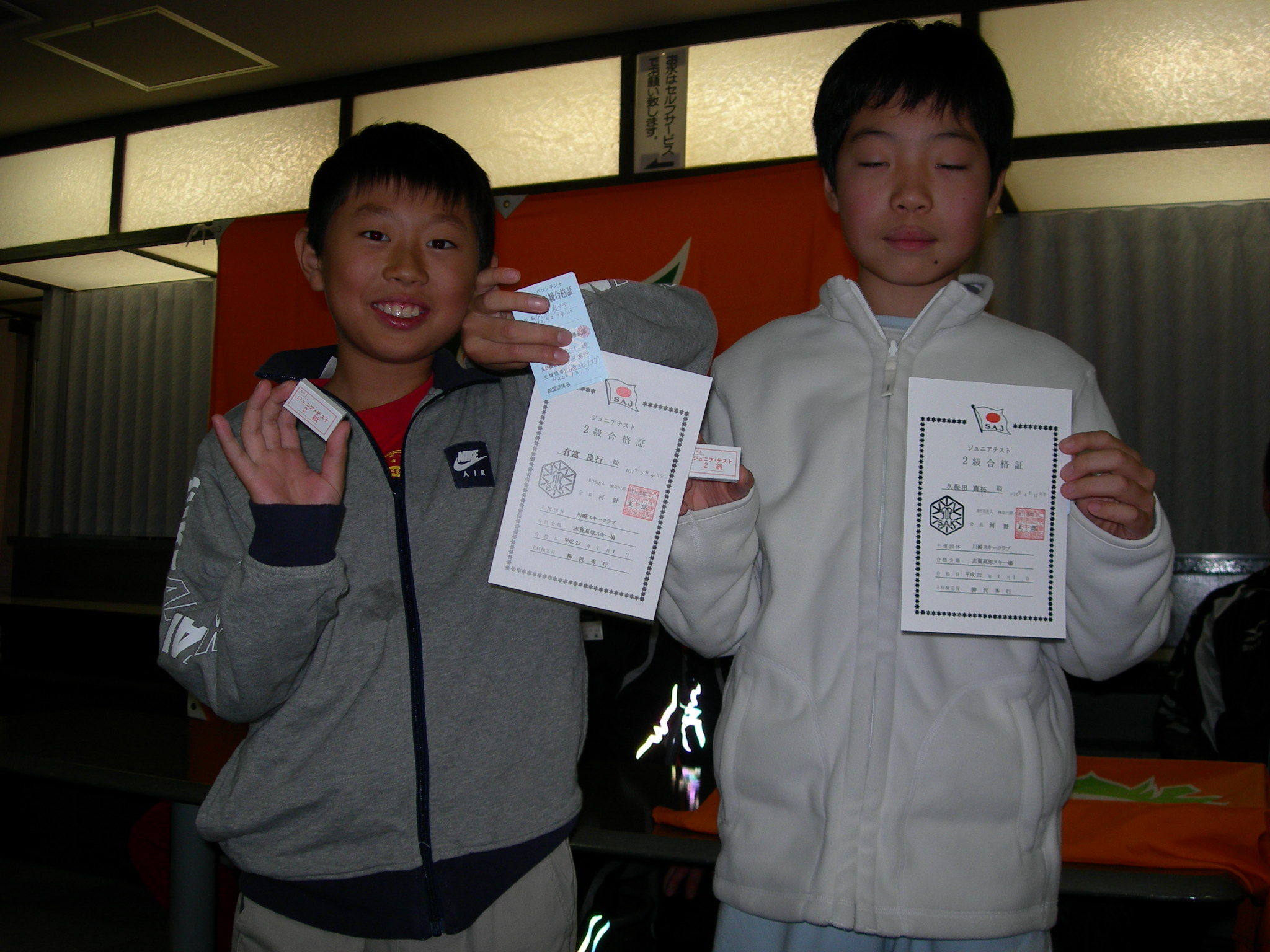 1月1日(金) 例年と日程が1日ずれ、今日、検定が行われるため、元旦ですがそんな気がしない1月1日です。 本日も吹雪の中、ゲレンデに出動です。 今シーズンから2級までは講習内検定なので緊張を和らげ普段の滑りが発揮出来るよう滑りなれたバーンで検定を行いました。 1級は検定バーンを設定しての従来の検定なので緊張も大きかったと思います。 結果は夜の合同ミーティングで発表です。 合同ミーティングでは検定発表の後、お楽しみの親睦会が行われ、ジャンケン大会では多くの景品をゲットした家族もありました。
