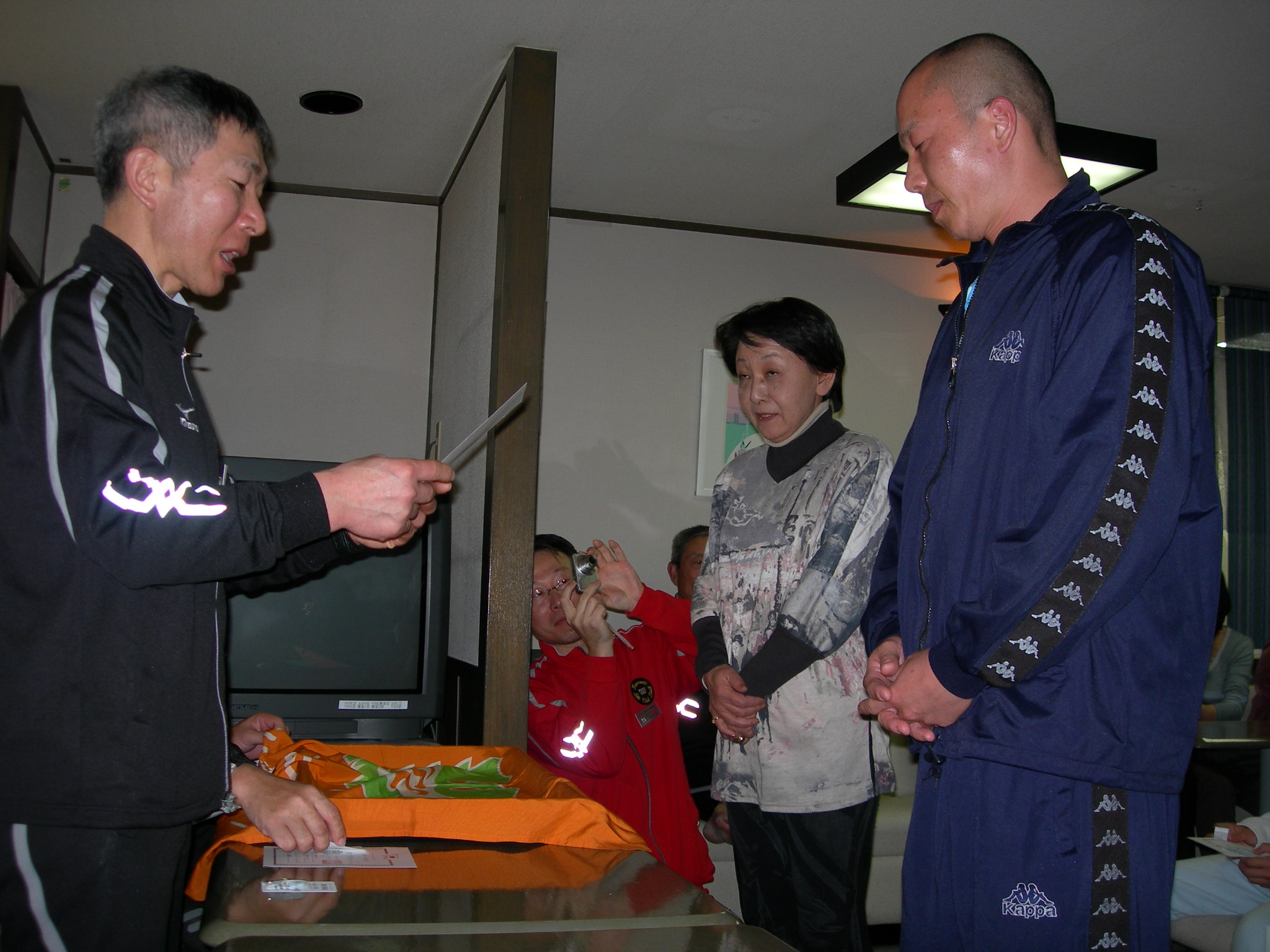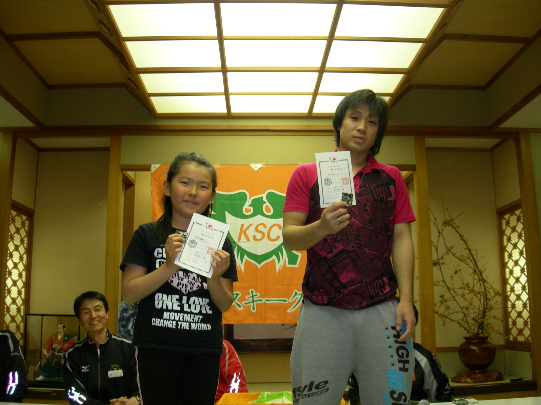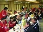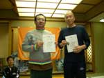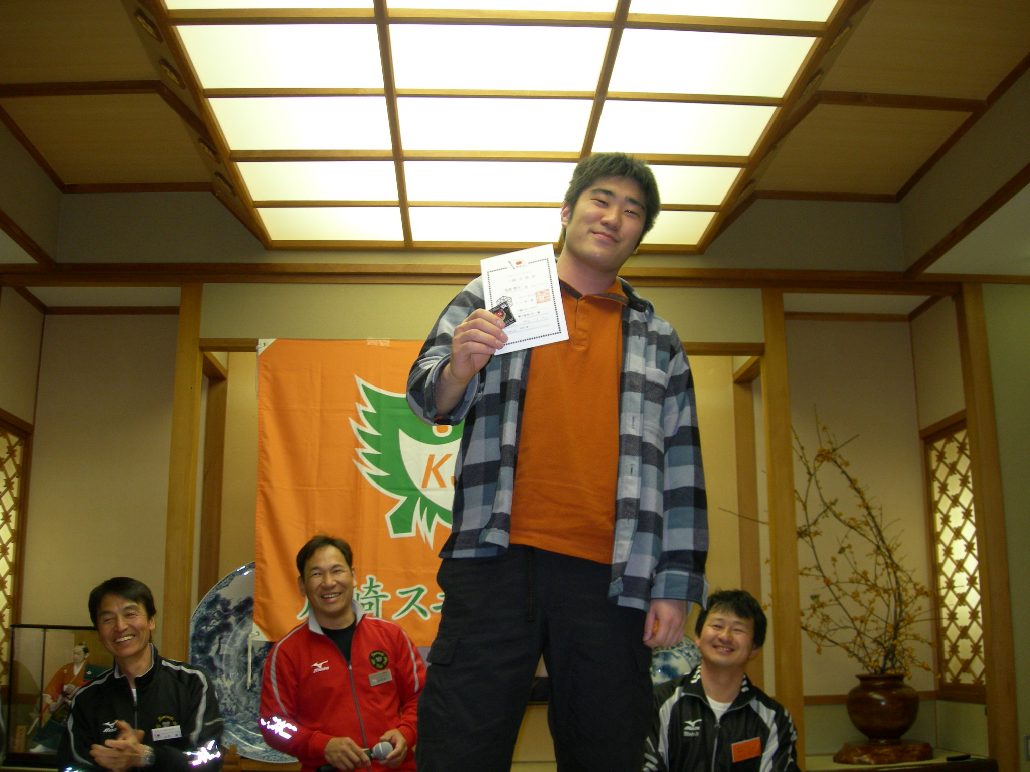 女子から順番に最後に指導員という滑走順で進めていきます。 転倒者続出でスタート付近の観客(出走待ちの選手たち)からは、歓声と激励が飛びます。 私は、ゴール審判の都合で、変則で一番スタートだったので、ゴールの様子しかわからなかったのですが、ゴール付近でも、転倒者がでていました。 最終旗門直前で爆裂して板が片方はずれて、一生懸命のぼって、最終旗門を通過してゴールを果たした不○さんや、最終旗門に体当たりし、ゴールを切らずにオペレーターに突っ込みそうになった野○先生など、ファイト?あふれるプレイが続出しました。 さてさて、結果は!? 20時から、恒例の懇親会&結果発表です。 結果は以下のとおりです。 一般女子1部 1位 新田 エリ子さん 2位 上澤友紀枝さん 3位 細島 成子さん 一般女子2部 1位 原口 咲子さん 2位 松井 寛乃さん 3位 土橋 理紗子さん 一般男子1部 1位 土橋 竜太郎さん 2位 高澤 昭二さん 3位 松山 勝信さん 一般男子2部 1位 並木 雅幸さん 2位 渡辺 誠司さん 3位 土橋 峻之さん 指導員の部 1位 松田 孝さん 2位 大澤 恵美さん←すごいぞ私(^o^)丿 3位 畠山 和久さん 特別賞の『榎本賞』は、今年も健在です。 前走の榎本先生のタイムにもっとも近い方に、榎本先生のポケットマネーから、金一封が贈られるのです。 獲得したのは… 永見 裕代さん(1走タイム) 新田 収さん(2走タイム) でした。