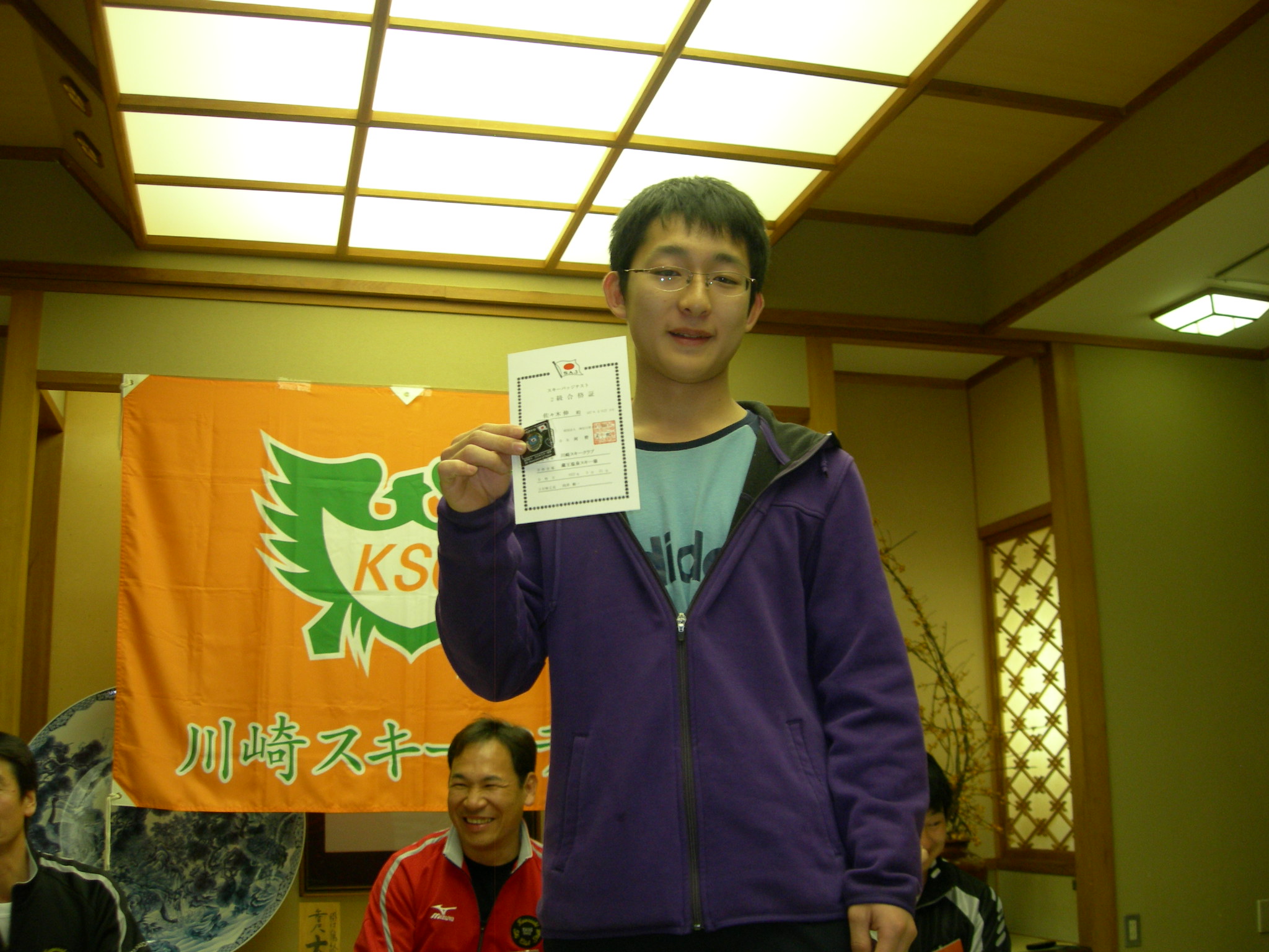 3月21日(日) 朝から風が強く、アヤシイ空模様です。 天気予報では、午前中はなんとかもつかもしれないけれど、午後には雨、夕方から雪…という感じです。 ゲレンデに行ってみると、あまりの風の強さに、ほとんどのリフトが運休しています。 上ノ台では、ジュピア前のペアとクワッドのみの運行で、天気が悪いとは言え連休中なのもあり、リフト乗り場はものすごい長蛇の列です。 午後一番に上ノ台方面で予定されていた1級の検定は、雨を避けるため、11時に比較的リフト待ちの少ないサンライズゲレンデに変更されました。 初心者班で記念撮影の後、開会式や検定の様子を撮影しようと思い、リフト待ちを計算に入れて30分前に上ノ台を出発しました。 すでに強風に雪が混じり、やや吹雪です。 ペアよりクワッドの方が、輸送能力が高いだろう=並ぶならクワッド?というわけで、クワッドの列に並びましたが… 進まない(-_-) 久々にリフト並びの小技を使いましたよ(^_^;) 並ぶ事25分…やっとリフトに乗れました。 開会式は絶望的です。 ダッシュで移動したら丁度検定員の紹介をしているところだったので、とりあえずそれらしい写真を何枚か撮影することに成功。 良かったです(^_^;) スタート係を頼まれましたが… 寒かったです。 本当に寒かったです。 いや、受検生の方々や、ゴールで手袋を外して、採点表を記入している検定員に比べたら、楽なんですが… 検定はいつものスタート位置が土が出ていた為、少し下げて行われた為、若干厳しい感じの採点になっていたようです。 結果は夜のお楽しみです。 夕方は本当に吹雪(>_<)という感じで、視界も悪く、早く引き上げて温泉を堪能した方が多かったようです。 夕食後、検定結果の発表会と懇親会が行われました。 また、会員で今年米寿を迎える瀧嶋さんに、クラブから記念品を贈らさせていただきました。 検定結果は 1級1名 2級1名 3級2名 4級2名 5級1名 の合格となりました。 合格された皆さん、おめでとうございました。 懇親会では、恒例のビンゴ大会で盛り上がりました。 何か良いものもらえましたか? 懇親会終了後も、いくつかのグループに分かれて、遅くまで盛り上がっていたようです。 睡眠不足は怪我の元ですよ〜(>_<)
