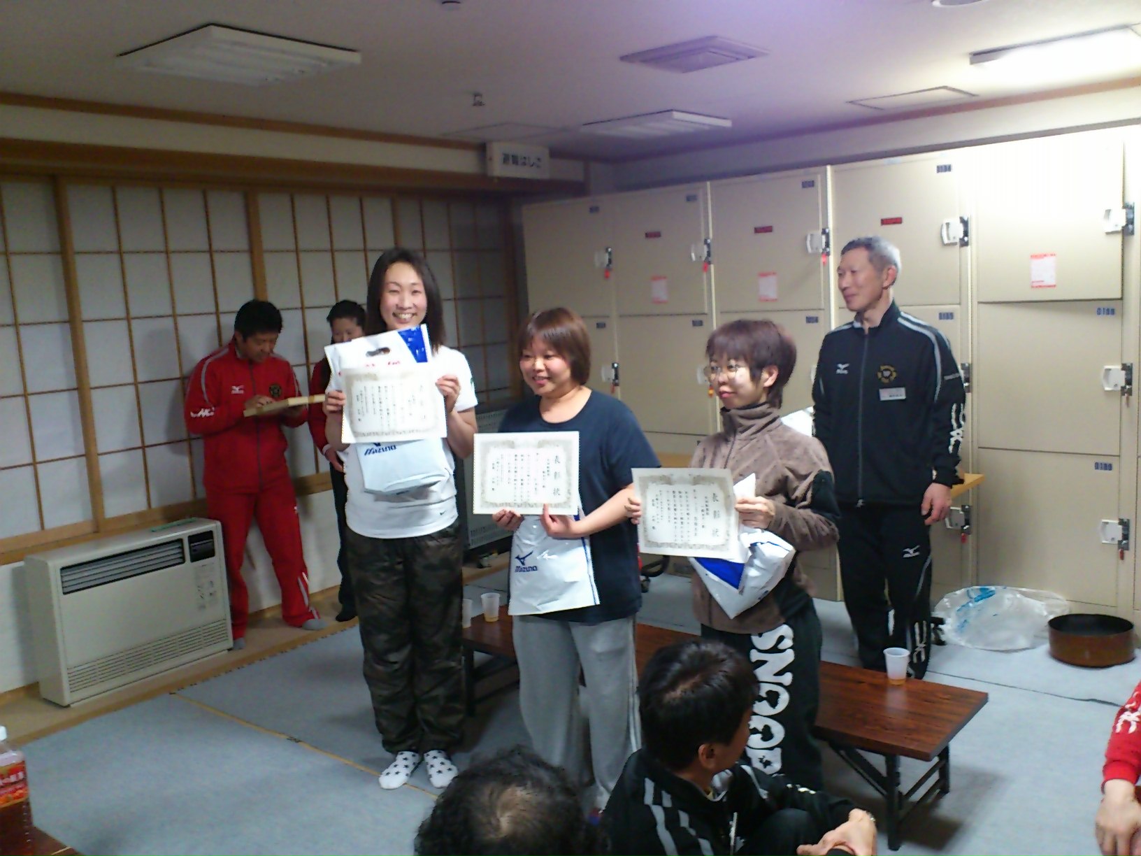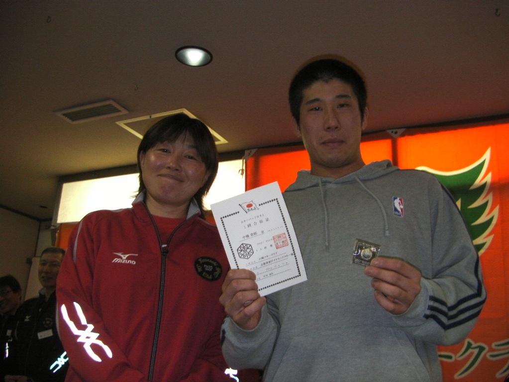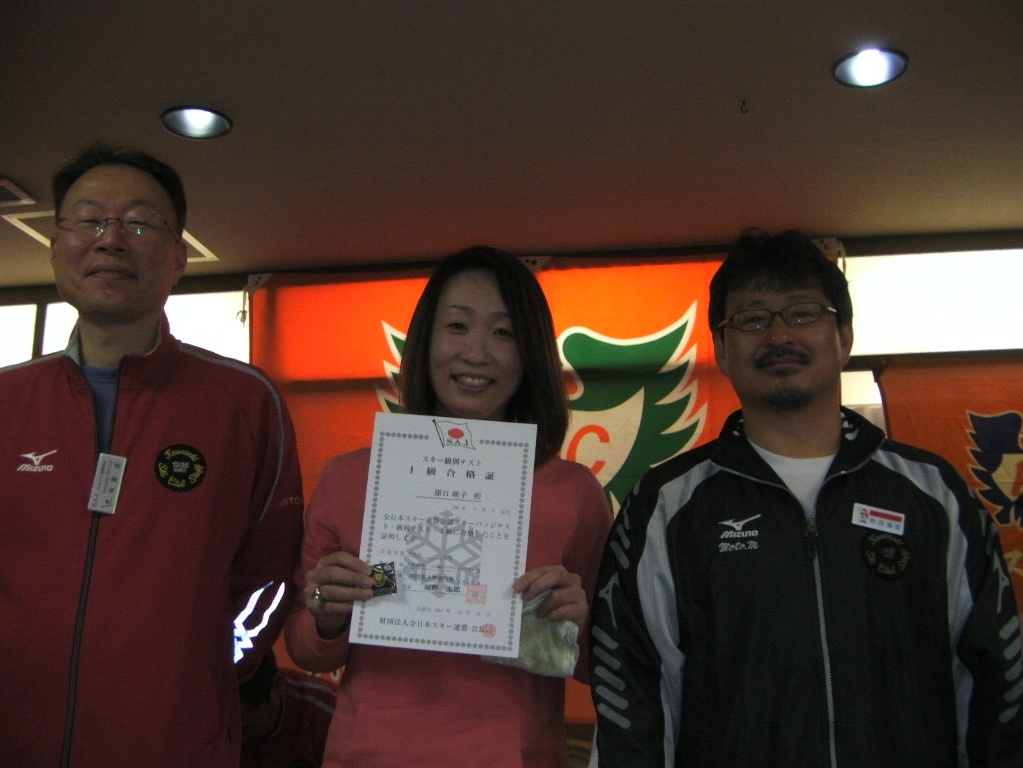 募集人数を上回る54名の参加で、今シーズン最後の雪上行事、納会がスタートしました。 あいにくの雨の中、しかしバスは満員です。 雪もまだ、たっぷり♪ …たっぷり降り続けています(-_-;) というより、ほとんど雨!? 到着時に雨だったことを考えるとかなりマシですが… レースを中止にするほどの降りではなかったので、まずはポールセットからです。 今回のセッターは平賀(あ)先生です。 雪が悪い為(雨混じりで重いっっ)縦目のコースセットになっていました。 今回も計測器は本格的で大会でも使われるものを使用します。 よって微妙な差でも、きっちり勝負がついてしまうのです。 コンマの世界の勝負です。 今回も笠谷先生が中上級モデルの試乗板をお持ちくださいました。 ありがとうございました。 ロッカースキーとか乗ってみましたよ♪ レースは2走の合計で競われます。 カテゴリーは一般の男女を2クラスに、中学生、指導員は男女混合の6カテゴリーです。 ともかく、2回とも完走しないことには、勝負に参加できないので、午前中の練習では、みんな真剣です。 お昼前にセット換えをし、昼食後にインスペクションをすませて、さあ、本番です!! あっというまに溝が刻まれていきます。 後半になってくると、最初のスピードに乗せたい急めな斜面で、コブや溝にやられて転倒する人が続出です。 私は、平賀(あ)先生の 「この上着はかなり、遅いです」 という言葉を信じて、一本目は上着を脱いで滑りましたが、コースアウト→登る、になった上、ヒートテック一枚という薄着に降り積もる、雨混じりの雪に根を上げて、2本目は上着を着て滑りました。 結果わかったこと…後半平地なこのコースでは、上着を着たらスピードが出ない(T-T) アイス賭けなきゃ良かったな…と思いました。 さてさて、皆さんの結果は!? 20時から、恒例の懇親会&結果発表です。 後ろのほうでは、笠谷先生の特設グッズ販売コーナーが出来ていました。 結果は以下のとおりです。 一般女子1部 1位 新田さん 2位 上澤さん 3位 小野さん ![]() 一般女子2部 1位 原口さん 2位 松井さん 3位 馬場さん ![]() 中学生の部 1位 石川さん ![]() 一般男子1部 1位 土橋さん 2位 松山さん 3位 波田さん ![]() 一般男子2部 1位 麻生さん 2位 山内さん 3位 不破さん ![]() 指導員の部 1位 平賀先生 2位 柳沢先生 3位 畠山先生 ![]() 特別賞の『榎本賞』は、今年も健在です。 前走の榎本先生のタイムにもっとも近い方に、榎本先生のポケットマネーから、金一封が贈られるのです。 今年は、商品券を用意してきてくださいました。 ただ、当日視界が悪かった為、野村先生が代走してくださいました。 獲得したのは… 男性 新田さん 女性 大澤(え)先生 でした。 しかし、本部でブーイングを浴びた私はジャンケンで他の方に譲りましたとも(T-T) みなさん、おめでとうございました。 ちなみに、ラップタイムは 平賀先生の34秒01でした。 今回の注目者は、今シーズンから参加の麻生さんでした。 総合3位に食い込んだ麻生さんは、 「こんなマジな闘いだとは思わなかったので…」 と、超一般スキーヤー的(茶ジャケットに可愛いニット帽)な格好で登場したものの、「以前ポールをやっていた」という発言を裏切らない、レーサーっぽい滑りで観衆にドヨメキをあげさせていました。 「次回参加する時は、ワンピと、レース用の曲がったストックを持ってきます(笑)」 とのことでした。 やっぱり、練習積んだ人が早いんですねぇ。 (来シーズンもレーキャンは参加者を募集しています) 今回はビンゴ大会ではなくて、抽選会になりました。 時間短縮で語れる時間が増えたのはいいですね。 半分以上の方に何か景品が渡ったようです。 みなさん、何かいいものゲットできましたか? 懇親会後は、各グループにわかれて、夜更けまで飲み、盛り上がったようです。 日曜日は予報通りの晴天です。 今回、宿が横手山寄りだったためか、横手山&渋峠限定の割安リフト券がフロントで売っていたため、横手山方面に行く方が多かったです。 本当に近いですし。 あの坂(横手山に行った事ある人はわかりますよね)を1度は登らなくちゃならないんですが、一日目の帰りで登るか、二日目の朝登るか、どちらが楽かは本人次第ですね。 ![]() 空は青く…暑い(^_^;) でも、渋峠は寒い少しくらいで、雪もよく、滑りやすかったです。 山頂で早めの昼食をとる人たちと、ひたすら滑る人たちとがいました。 今回も笠谷先生のメンテナンスを活用する方が結構いました。 ここで預けると、もって帰らなくてよく、仕上がった板が送られてくるので、もうシーズン終了の方には大人気です。 バスは順調に出発し、いつもの「ビアンテ」で昼食をとり、DVDを見ながら帰り…たかったのですが、積み忘れたらしく、何もありませんでした。 「DVDの選択権があるから」という理由でバス長になった畠山先生がしょんぼりしていたら、DVDを貸してくださった方がいました。 猿の惑星ジェネシス、とかいうのを見ました。 
